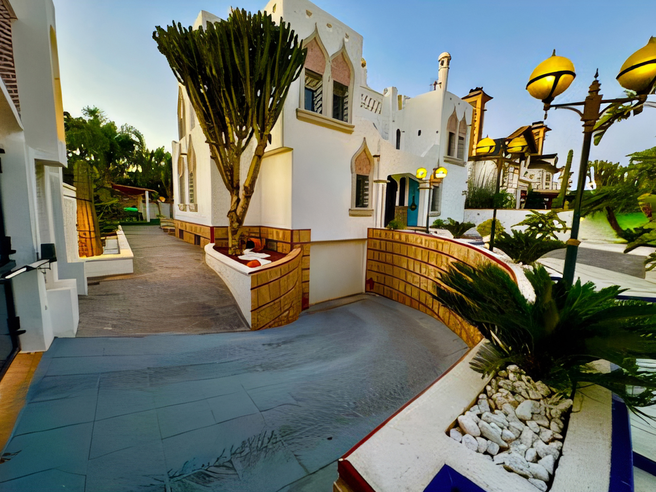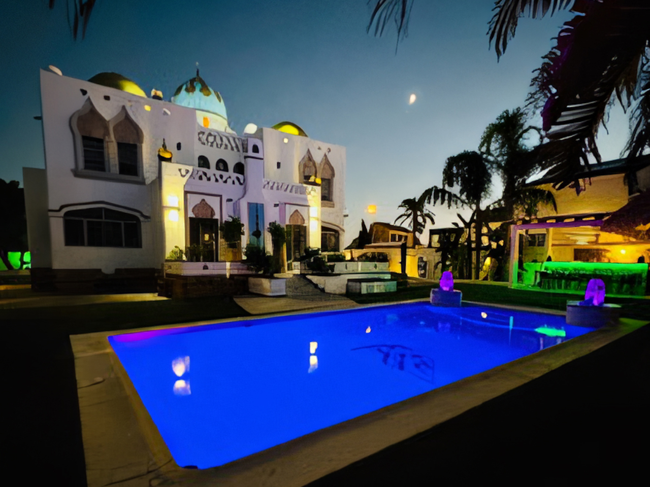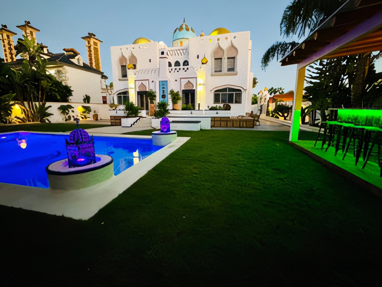 La Villa Árabe es un oasis de lujo inspirado en las Mil y Una Noches, situada junto al Paraje Natural de Punta Entinas-Sabinar y a tan solo 10 minutos de la playa. Su imponente cúpula azul es el centro visual de la villa, evocando la grandeza y la magia de los antiguos palacios árabes. Los interiores son igualmente impactantes, decorados con frescos originales del renombrado artista Waldi Wrobel, celosías iluminadas, y fuentes árabes interiores que añaden serenidad y elegancia a los espacios. Los suelos de mármol, arcos de madera tallada, azulejos andalusí y nazari, y carpintería de pino tea crean una atmósfera de lujo y exotismo. El dormitorio principal, con una cama de dosel y baño en suite, se abre a una gran terraza con vistas al jardín.