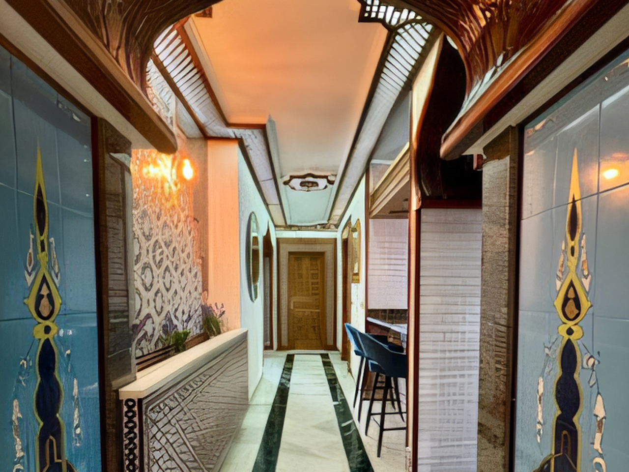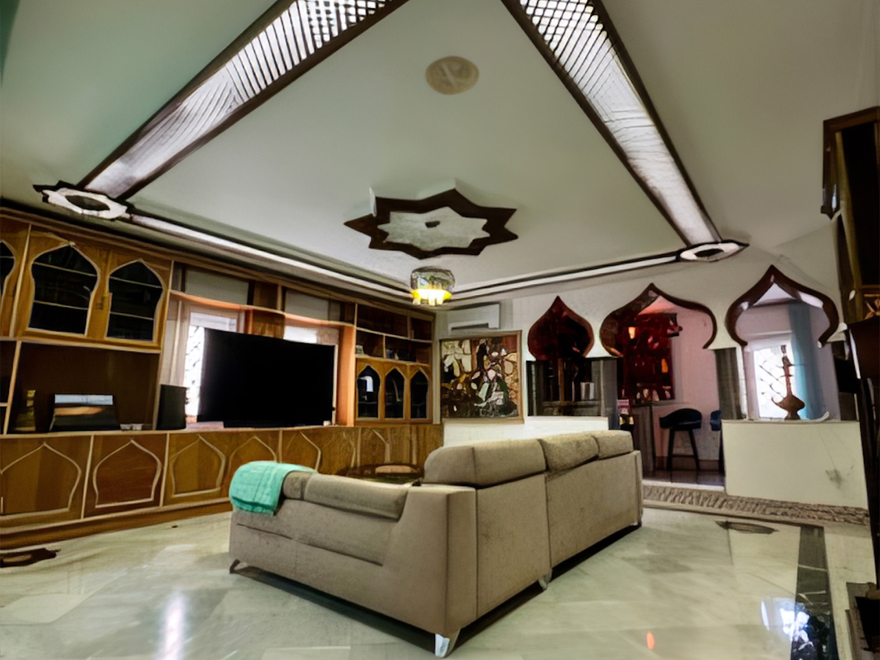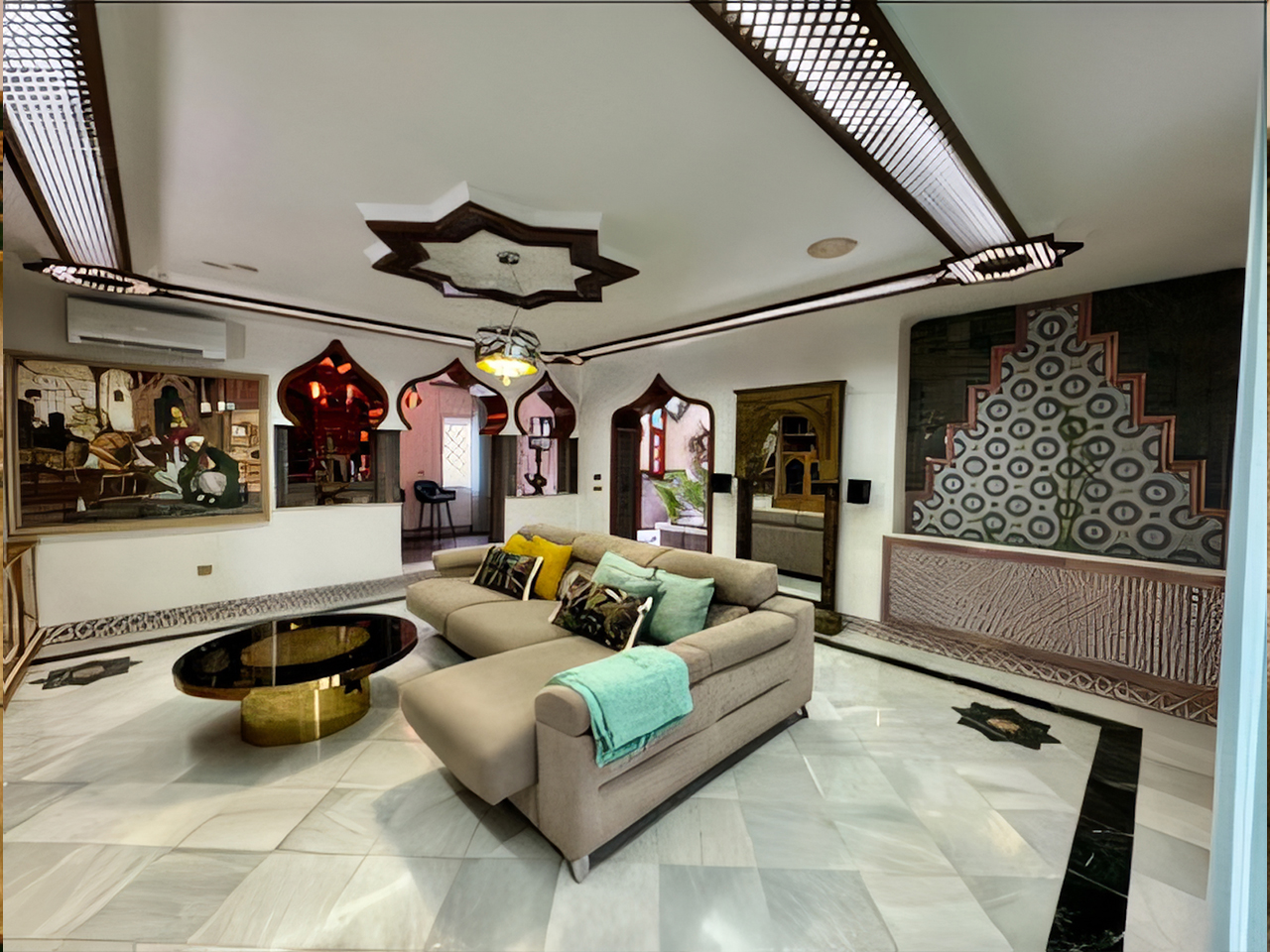 La Villa Árabe es un oasis de lujo inspirado en las Mil y Una Noches, situada junto al Paraje Natural de Punta Entinas-Sabinar y a tan solo 10 minutos de la playa. Su imponente cúpula azul es el centro visual de la villa, evocando la grandeza y la magia de los antiguos palacios árabes. Los interiores son igualmente impactantes, decorados con frescos originales del renombrado artista Waldi Wrobel, celosías iluminadas, y fuentes árabes interiores que añaden serenidad y elegancia a los espacios. Los suelos de mármol, arcos de madera tallada, azulejos andalusí y nazari, y carpintería de pino tea crean una atmósfera de lujo y exotismo. El dormitorio principal, con una cama de dosel y baño en suite, se abre a una gran terraza con vistas al jardín.